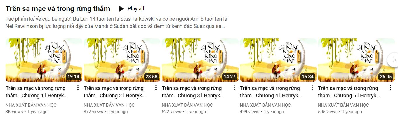 Mình quan tâm tới playlist Truyện thiếu nhi. Như ở hình, các bạn có thể thấy một số cuốn truyện tiêu biểu dành cho trẻ em: Những cuộc phiêu lưu của Huckleberry Finn; Trên sa mạc và trong rừng thẳm; Không gia đình…