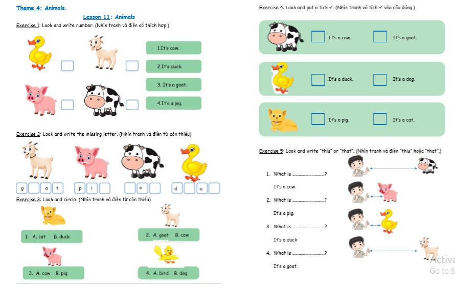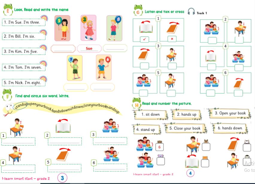 - Phát triển kỹ năng nghe và đọc hiểu: Nhiều bài tập yêu cầu học sinh phải đọc hiểu yêu cầu hoặc nghe file âm thanh để hoàn thành (ví dụ: “Look, read and tick”, “Look, read and write”). Điều này giúp các em rèn luyện đồng thời kỹ năng đọc và nghe.