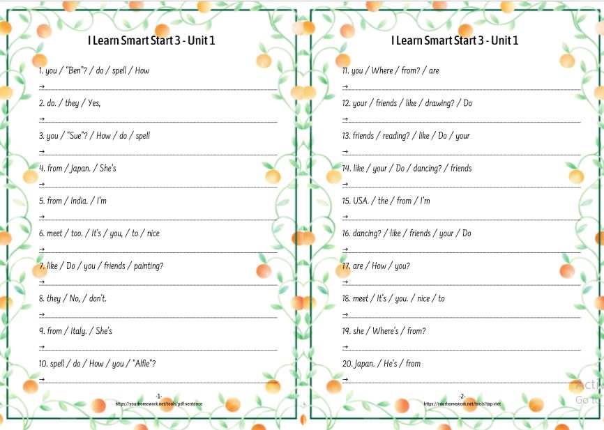 - Viết (Writing): Các bài tập hoàn thành câu, viết đoạn văn ngắn, sắp xếp từ thành câu có nghĩa, giúp rèn luyện khả năng viết và chính tả.
