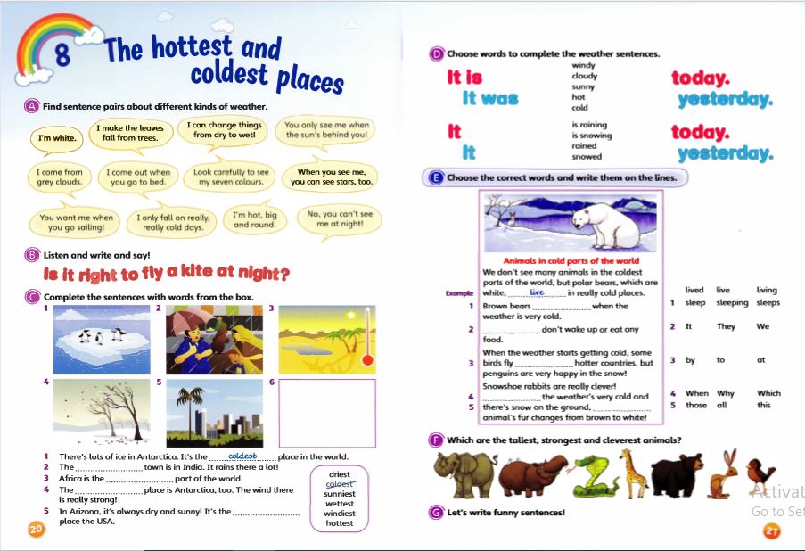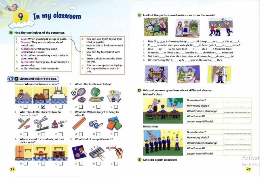 Bài tập đa dạng hơn: đọc hiểu ngắn, nghe chọn tranh, viết câu hoàn chỉnh.