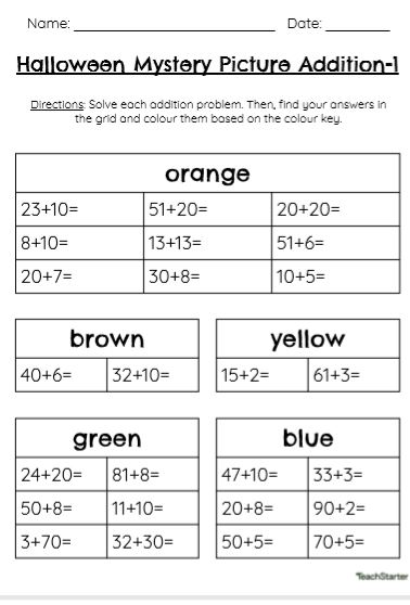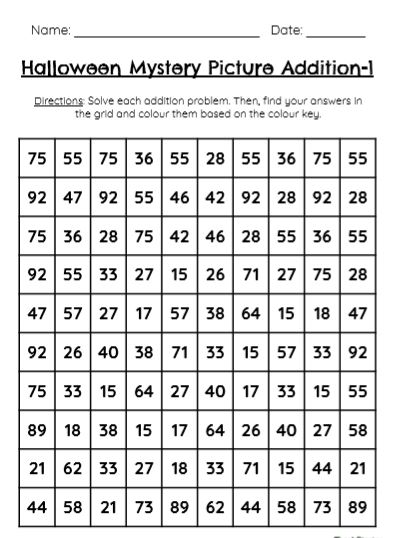 Thực hành cộng các số có 2 chữ số lên tới 99 với bộ tranh vẽ bí ẩn chủ đề Halloween.