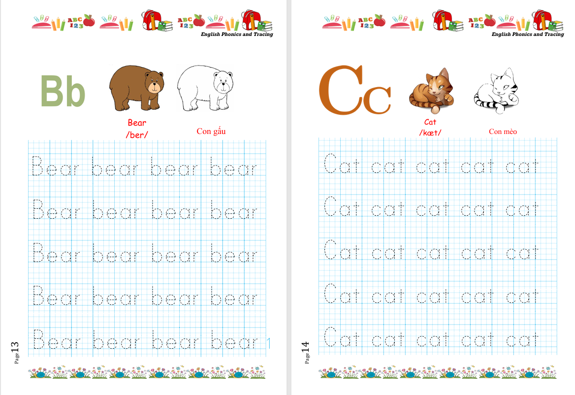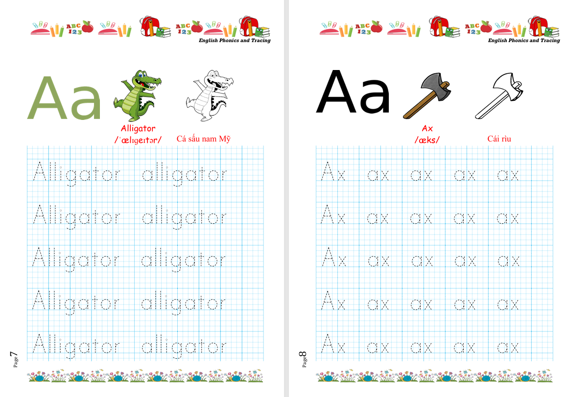 Phonics and Tracing the Alphabet là bộ tài liệu tập viết tiếng Anh giúp trẻ làm quen 26 chữ cái từ A–Z thông qua phương pháp phonics kết hợp luyện viết. Mỗi trang được thiết kế khoa học, có hình minh họa sinh động, từ vựng mẫu, phiên âm quốc tế IPA và các dòng chữ nét đứt để bé tập tô – viết đúng kỹ thuật. Đây là tài liệu vô cùng hữu ích cho trẻ mầm non và tiểu học đang trong giai đoạn phát triển kỹ năng ngôn ngữ đầu đời.