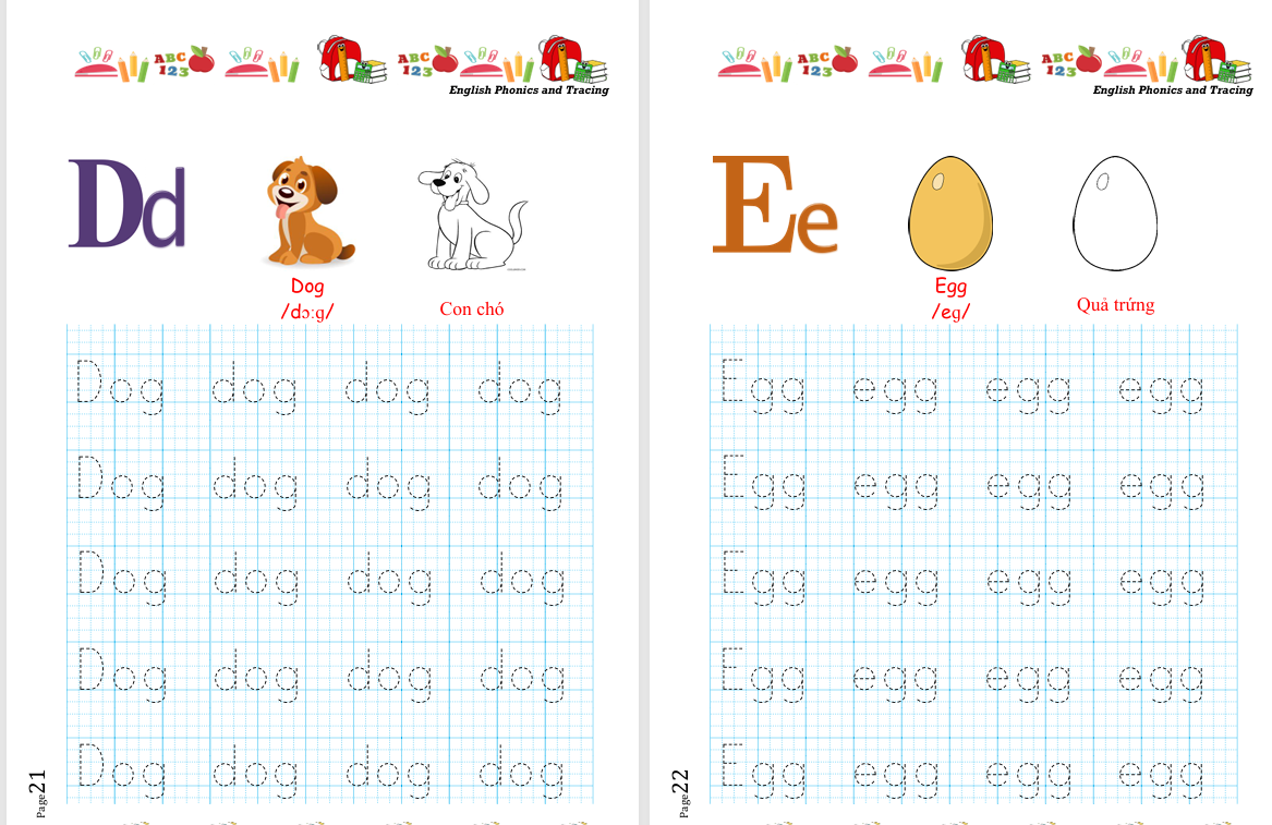 Từ vựng minh họa theo từng chữ cái (Dog, Egg, Ant, Ball…), giúp bé ghi nhớ tự nhiên.