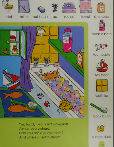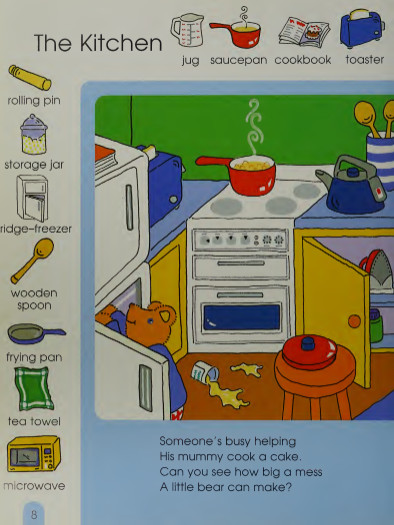 Những hình ảnh có màu sắc rực rỡ được minh hoạ cho những đồ vật quen thuộc với trẻ. Mỗi trang sẽ khuyến khích trẻ xem kỹ các bức tranh, tìm kiếm và ghi nhớ từ vựng được chú thích dưới chân từng hình minh hoạ.