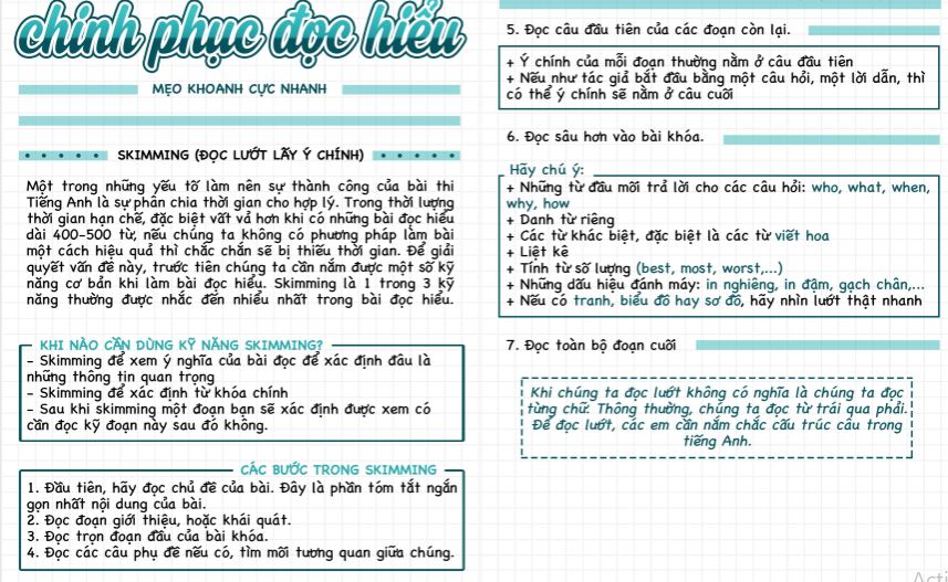 Mẹo skimming – scanning giúp đọc nhanh, hiểu đúng ý chính.